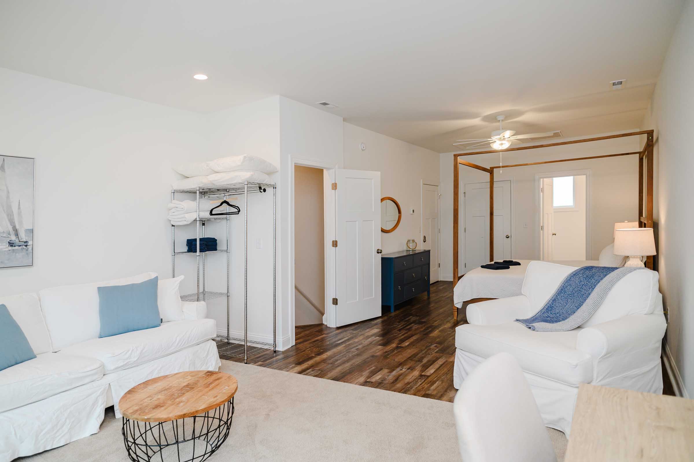 Spacious king primary suite in a Topsail Island vacation rental featuring elegant design, high-quality furnishings, and a sleeper sofa for accommodating larger groups.